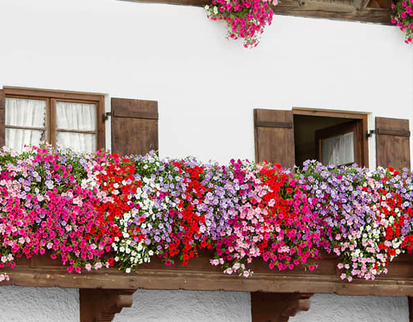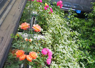 窗臺美化,考慮到要形成立體景觀及遮擋容器,植物要求以開花植物及藤本植物為主,用時令花草及藤本灌木,形成有層次的五彩繽紛的立體效果。