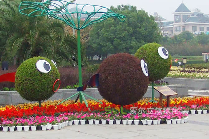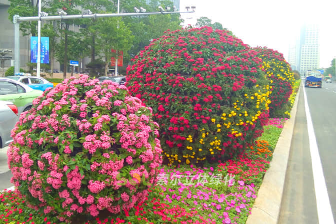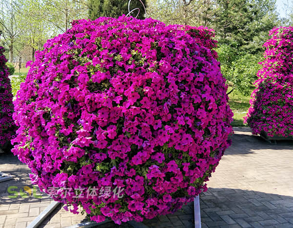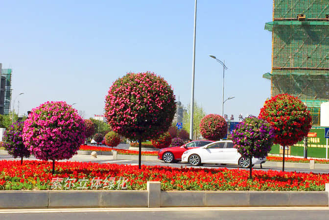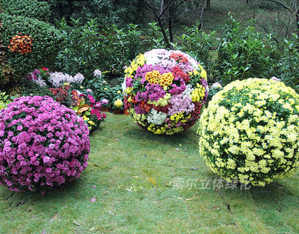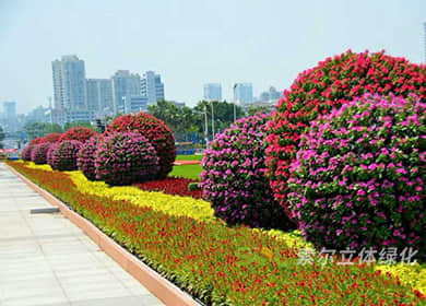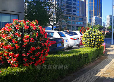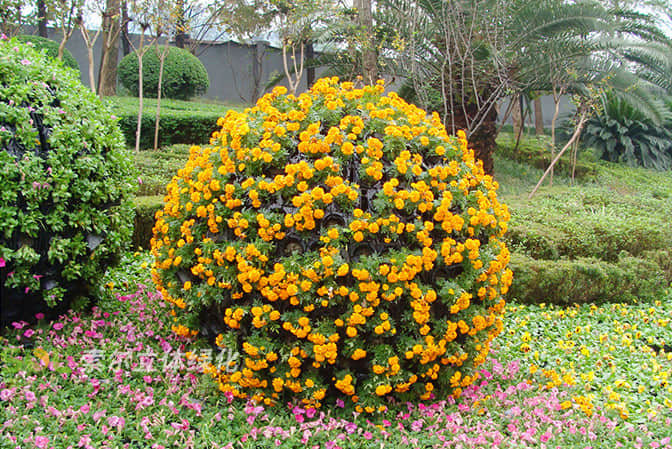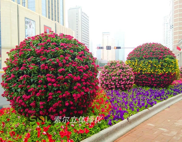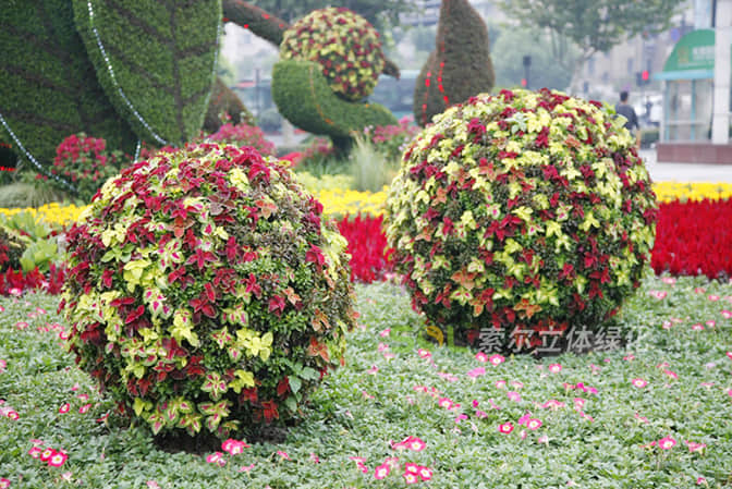 花球既能獨(dú)立成景,又可在綠雕中應(yīng)用,方式多樣。節(jié)日、慶典、會(huì)議、活動(dòng)等重要項(xiàng)目都可運(yùn)用,用紅色系、橙色系、黃色系等花卉,烘托熱烈氣氛。
